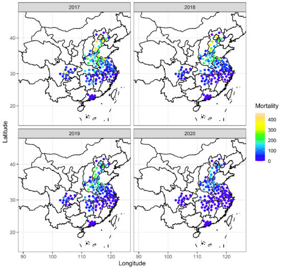In this study, we used the human health impact function to estimate the short-term health impacts attributable to PM2.5. The health impact function is a classic risk assessment method [11,46], which has been recommended by the Chinese Ministry of Ecology and Environment and EPA. The premature mortality attributed to PM2.5 exposure is estimated as follows: