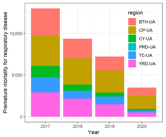 High PM2.5 concentration can cause many health risks, such as respiratory diseases, cardiovascular diseases, and lung cancer. To evaluate the health impacts of PM2.5 pollution in six regions, the respiratory premature mortalities attributed to PM2.5 from 2017 to 2020 were calculated. As displayed in Figure 9, the premature mortalities varied in region and year. The total respiratory premature mortalities in six regions from 2017 to 2020 were 13005, 9357, 7227, and 3504, respectively (Figure 10). In BTH-UA, the respiratory premature mortalities attributed to PM2.5 pollution decreased by 69.4% from 2017 (3223 deaths) to 2020 (987 deaths). Among 13 cities in BTH-UA, the top five with the average premature mortalities over four years were Shijiazhuang (314), Handan (296), Baoding (253), Beijing (243), and Tianjin (241), respectively. Li et al. [66] found that in the BTH-UA, in 2013, only 46% of the total premature deaths were attributable to local consumption, and atmospheric transport of pollutants, mainly from the surrounding areas, accounted for 29% of total deaths. Due to the huge population and high PM2.5 concentration, CP-UA has the highest respiratory premature mortalities in six urban agglomerations, with 3695, 3165, 2686, and 1600 during the period of 2017–2020, respectively. The top five cities with mean premature mortalities related to PM2.5 during the period of 2017–2020 were Zhengzhou (307), Heze (207), Nanyang (197), Anyang (184), and Zhoukou (182). In contrast, the five cities with the lowest mean premature mortalities were Hebi (35), Sanmenxia (39), Jincheng (42), Changzhi (50), and Luohe (54), respectively. The respiratory premature mortalities attributed to PM2.5 pollution in YRD-UA also decreased from 2899, in 2017, to 518, in 2020. Xuzhou, Fuyang and Suzhou were with relatively high mortality. In TC-UA, an 85.5% reduction in premature mortalities from 2017 to 2020 was observed. The most serious city was Wuhan, with an annual average of 122 cases. From 2017 to 2020, respiratory premature mortalities in TC-UA were 1333, 732, 452, and 143, respectively. In CY-UA, the reduction was 89.3% over four years, with 143 deaths in 2020. The population in some cities was almost at the same level, but the estimated premature mortalities were very different. For example, the population of Shanghai is 12.0% larger than that of Beijing, while the premature mortalities in Beijing were five times higher than that in Shanghai. This indicated that premature mortality is sensitive to PM2.5 concentration.