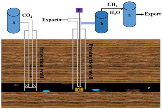 Schematic diagram of CO2 storage in coal seams: (a) compressor; (b) water–gas separation system; (c) pump; (d) deep well pump; (e) coal seam.