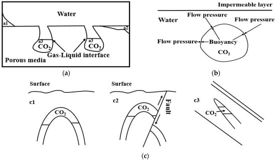 Schematic diagram of CO2 storage mechanism in saline aquifers: (a) residual trapping ((a1) dissolved trapping; (a2) mineralization trapping; (a3) residual trapping); (b) hydrodynamic trapping; (c) structural trapping ((c1) anticline trapping; (c2) block trapping; (c3) pinch out trapping).