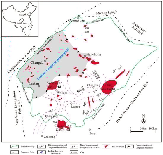 Geological sketch map of the Sichuan Basin, showing the locations of the major shale gas blocks, isolines of Ro values, and the shale thickness of the Longmaxi Formation (created by Cao et al. [56]).