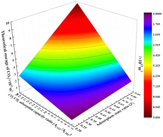 Using these parameters, we calculate the CO2 storage potential of the Changning shale gas block, as shown in Figure 5. When X is 20% and is 2.68, the minimum CO2 storage capacity of the Changning block is 8.016 × 1011 m3 according to Equation (1); when X is 85% and is 19.41, the maximum CO2 storage capacity of the Changning block is 9.821 × 1012 m3 by calculation. Both of these are greater than the shale gas reserves of the block itself (6 × 1011 m3).