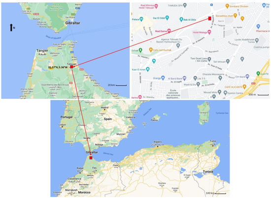 Sampling site (35.57° N, 5.36° W) for measurement of the atmospheric aerosols in Tetouan city (red square), located in the Mediterranean region (bottom panel), close to the historical city center of Tetouan (upper right panel) and in an urban area (upper left panel). Note the different scales of the maps.