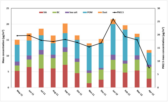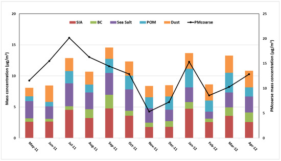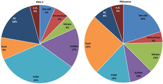 Figure 2 depicts the mean picture of the collected particulate matter over the 12 months and the relative abundance of the different components of the identified chemical mass compositions of PM2.5 and PMcoarse. As shown in Figure 2, the chemical compositions of the two aerosol size fractions are not similar, indicating their different origins and atmospheric lifetimes [61]. All analyzed components are present in both PM2.5 and PMcoarse but mineral dust and sea salt contribute more to the coarse fraction, whereas POM, BC, and SO42− contribute more to the fine fraction. Putaud et al. [62] indicated that PM constituents’ relative contributions to PM mass reflect changes in emission sources and processes that control aerosol compositions. Moreover, aerosols can change their size and chemical composition by the coagulation of particles of different origins and by condensation products resulting from gas-phase reactions [63,64].