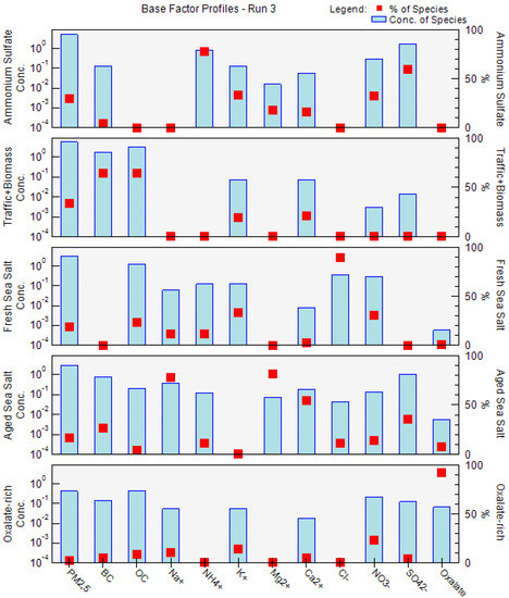 Another good method for additional insights regarding aerosol sources is the application of the positive matrix factorization (PMF) source apportionment method based on factor analysis with non-negativity constraints. It is widely employed as a reference model for source apportionment for atmospheric aerosol [18,19,20]. The most important feature of the PMF is the ability to attribute the observed concentrations to their major emission sources with little to no reliable information about sources that contribute to PM levels at a receptor site, as well as the potential to integrate uncertainties associated with sample measurements in the input dataset. However, Souto-Oliveira et al. [21] and Bove et al. [22] reported some limitations of this model such as sensitivity to collinearity of sources with similar chemical profiles.