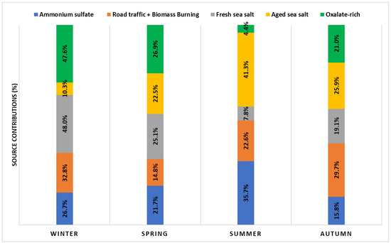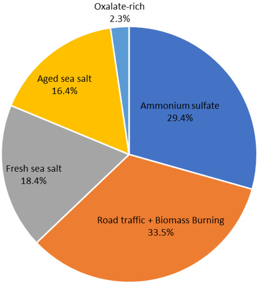 On the other hand, a noticeable seasonality of the PMF-resolved factor contributions was observed from the previous PMF analyses. With about 48% of the PM2.5 mass during winter and less than 8% and 5% during summer, the fresh sea salt and oxalate-rich factors, respectively, showed the strongest seasonality among all factors identified (Figure 6 and Figure S3). However, ammonium sulfate and aged sea salt factors can contribute to a significant amount of PM2.5 during the summer months, with an average contribution of 35.7% and 41.3%, respectively. Conversely, the road traffic and biomass burning factor does not present a clear seasonality pattern.