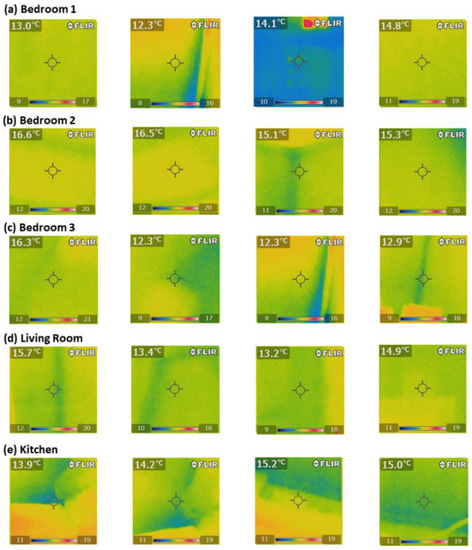 The thermal images were taken using the FLIR thermal imaging camera to determine the temperatures on those surfaces. Figure 1 shows the top corner surface images for the walls of each room in the house. As described above, the surface wall temperature in bedrooms 1 and 3 (Figure 1a,c) were colder compared to bedroom 2. As shown in Table 2, bedrooms 1 and 3 each had one occupant whilst bedroom 2 had two adults and one infant (see Figure 1b). In bedroom 1 the average surface temperatures for each wall ranged from 12.3 to 14.8, with the coldest surface area reading 8 and the warmest 19, while bedroom 3 had an average temperature range between 12.3 and 16.3, with the coldest surface area reading 8 and the warmest 21. Bedroom 2′s average temperature for each wall measured between 15.1 and 16.6 with a smaller range: the coldest surface area reading 11 and the warmest was 20. This greater warmth could be due to the number of occupants in the room. Figure 1d,e shows the surface temperature for the living room and kitchen. Respectively, these ranged from 13.2 to 15.7 and 13.9 to 15.2.