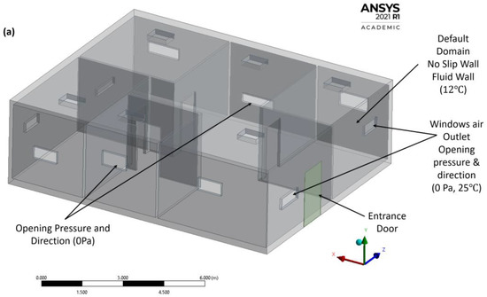 A model of the case-study house is simulated using ANSYS CFX Version 2021 R1 (Figure 2), to identify the potential to improve the ventilation, air flow and temperature via an HVAC system in the house. The house dimensions are 11 × 9 × 3 m. The proposed system modeled here would be achieved through a ducted heat pump system; the precise specifications of the heat pump and ducting are not included in this study. After constructing the CAD file using Design Modeler in the ANSYS workbench, we then set up the physical conditions.