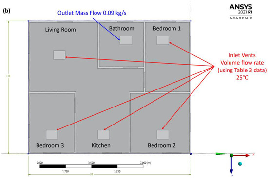During ventilation, aged indoor air is replaced with fresh air. ASHRAE standard 55-2017 [17] recommend appropriate ventilation of occupied building to prevent excessive moisture levels, odours, volatile organic compounds (VOCs) and other pollutants such as formaldehyde and radon, which are harmful to occupants’ health [6]. Areas which generate high moisture levels: bathrooms, kitchens, garages and common areas, must be ventilated to prevent the high relative humidity fostering growth of mould and damage to building materials [17]. Therefore, based on ANSI/ASHRAE Standard 62.1 and 62.2 [21], we assume the setup of air flow for each room in the house depending on the size of each duct, we empirically calculated the air flow rate, with a total volume flow rate of 0.015 which is shown in Table 3. The vents are fed from the ductwork, with air entering each room through its vent, as shown in Figure 2. The temperature was set at 25 and relative humidity to 45%, based on ASHRAE standard 55-2017 [17]. The solver control was set to maximum 1000 iterations, with a physical timescale of two seconds, enabling the conservation target. The CFD simulation was performed using the following computer specifications: Intel® CoreTM i7-8750H CPU @ 2.20GHz 2.21 GHz and 31.9 GB usable, 64-bit Operating System, Dell, Round Rock, TX, USA.