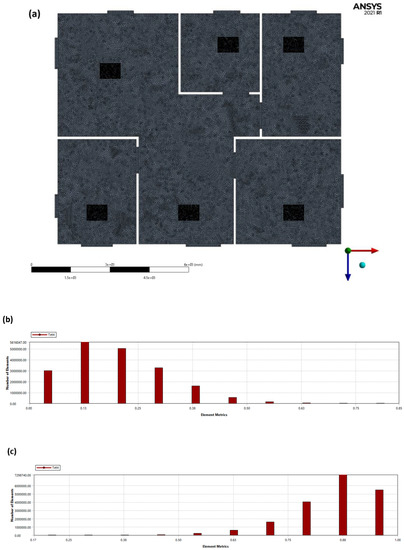 (a) The mesh geometry for the house (top-view), (b) the quality of the mesh showing the skewness and (c) the element quality.
