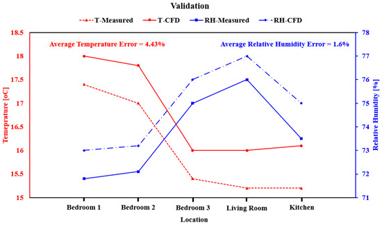 The initial model with no ventilation was validated against the temperature and relative humidity measurements taken from the house (as described in Table 2), with an average error 4.43% and 1.6%, respectively, as shown in Figure 4. This error size is within the range accepted in the literature [10,13].