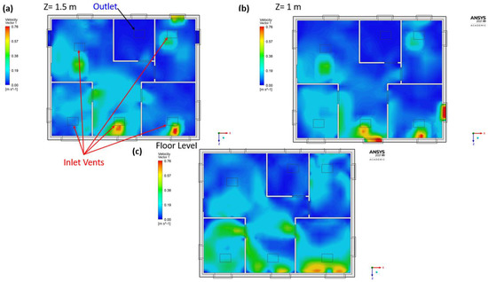The analysis of the air velocity contours and vector (top view) in the house at different height (a) 1.5 m, (b) 1 m and (c) (finished) floor level.