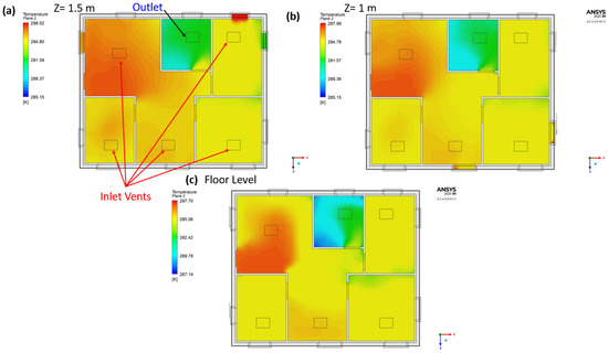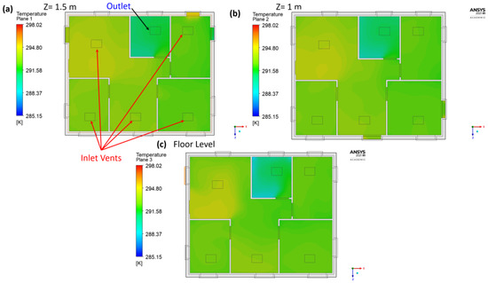 Temperature profiles distribution for the house (top view) using Healthy Home standards 2019 inlet temperature at different heights (a) 1.5 m, (b) 1 m, and (c) the (finished) floor.