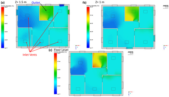Relative humidity (%) profiles distribution for the house (top view) at different heights (a) 1.5 m, (b) 1 m, and (c) the (finished) floor.