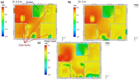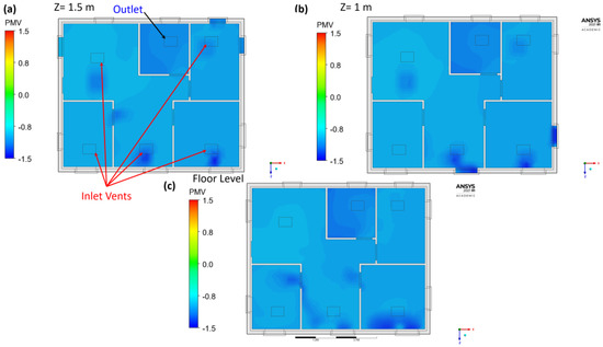 The predicted mean vote (PMV) profiles distribution for the house (top view) using ASHRAE 55-2017 inlet temperature at different heights (a) 1.5 m, (b) 1 m, and (c) the (finished) floor.