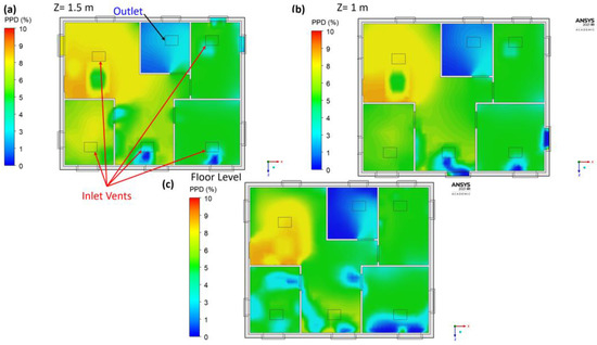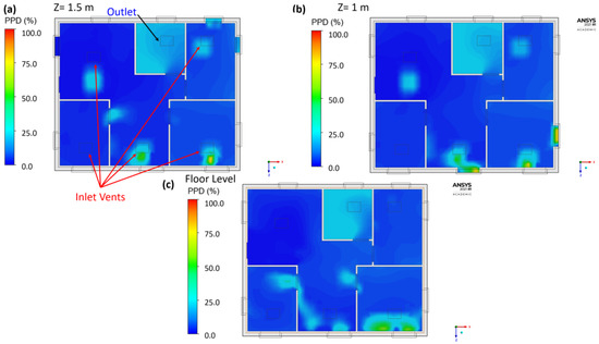 The predicted percentage dissatisfied (PPD) profiles distribution for the house (top view) using ASHRAE 55-2017 inlet temperature at different heights (a) 1.5 m, (b) 1 m, and (c) the (finished) floor.