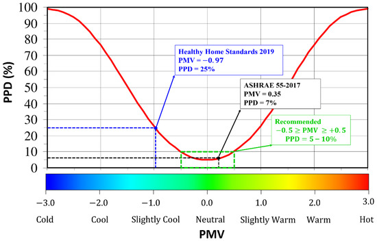 The PMV and PPD for the Healthy Home standards 2019 and for the ASHRAE 55-2017.