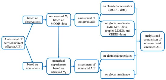 We evaluated the aerosol indirect effects based on observations and simulations of COSMO-Ru numerical weather prediction model. A brief flowchart of the research is shown in Figure 1. Further, the applied observation data, methods of Nd retrievals, the structure of numerical experiments, analysis and comparisons of results are presented in detail.