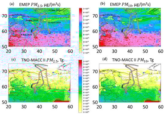 The northern advection air masses coming to Moscow region originate from Northern Atlantic, Arctic Ocean, the northern parts of Siberia and European part of Russia. There are not any major emission sources of PM2.5 and PM10 in these areas according to EMEP (https://www.ceip.at/, accessed on 15 March 2021) and TNO-MACC II (https://eccad.aeris-data.fr, accessed on 15 March 2021). Usual annual anthropogenic emissions of PM2.5 and PM10 based on EMEP database (flux in µg/(m2s), year 2009) and TNO-MACC II database (emission in Tg per year, year 2017) are shown in Figure 2.