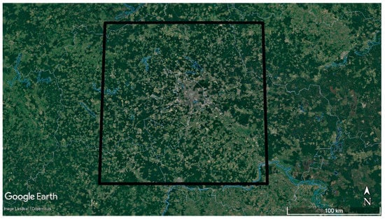 We carried out numerical experiments with the COSMO model with 1.1 km grid spacing [] over the Moscow region for NWP cases. The region of simulations is shown in Figure 3.