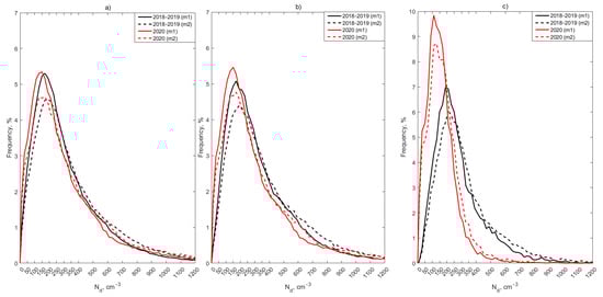 The Nd distribution for the NWP cases (Figure 4c) is narrower and values higher than 300 cm−3 are not presented practically for the days in 2020 compared to 2018–2019. The Nd median values were 144 ± 2 cm−3 (method 1) and 161 ± 3 cm−3 (method 2) in 2020, while in 2018–2019 Nd median values were 240 ± 4 cm−3 (method 1) and 272 ± 4 cm−3 (method 2), which is 80–110 cm−3 (39–41%) larger than in 2020. The difference in retrieved Nd between the two methods is about 14%, which can be attributed to the droplet effective radius influence [].