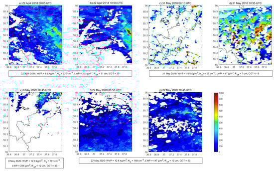 Spatial distribution of the droplet number concentration retrieved by method 2 for NWP sample. Each subfigure (a–g) describes an observational case.