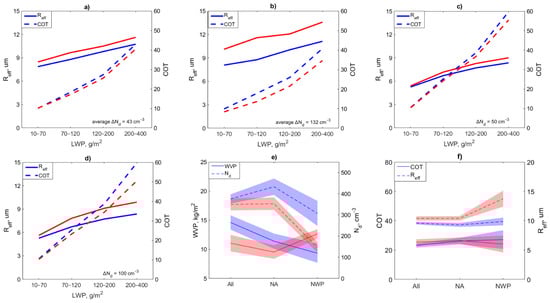 The changes in the cloud droplet number concentration were accompanied by the changes in other cloud parameters as well as by variations in global shortwave irradiance. In these experiments, we deal with the first indirect aerosol effect in observations and simulations; however, this effect may provide further changes in cloud properties. Correlations of liquid water path with droplet effective radius and liquid cloud optical thickness are presented in Figure 6a,b for two samples—NA and NWP—correspondingly for 2020 (shown in red) and 2018–2019 (shown in blue). LWP data are according to the MODIS observations with 1 km grid spacing. We used the intervals of liquid water path according to the evaluation of cloud–aerosol observations for 10 years, described in [].