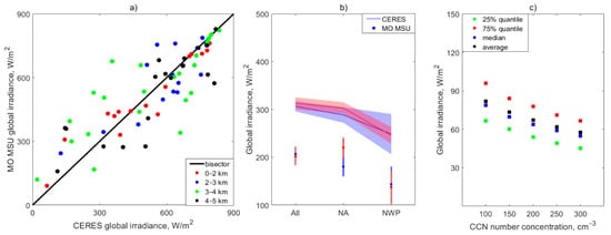 Observed and simulated global irradiance at ground: (a) CERES and MO MSU synchronous data (color indicates the distance between observations points); (b) CERES data over Moscow region (the same samples as for Figure 6e–f) and ground-based MO MSU global irradiance for three samples (data for 2020 is marked by red, for 2018–2019—by blue colors); (c) simulated global irradiance in dependence on Nccn for LWP = 200–400 gm−2 for overcast condition. Solar height is equal 40º.