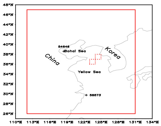 In this study, a sea fog process in the Yellow Sea and Bohai Sea on 21 January 2013 was selected. To carefully analyze the evolution process of this sea fog case, the Weather Research and Forecasting (WRF) model was employed. Figure 1 shows the main simulation area with 3 km resolution, the buoy observation stations, and two key regions for analyzing the differences in sea fog formation and evolution mechanism.