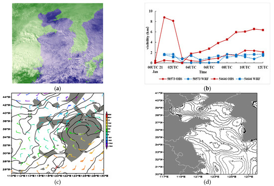 (a) HMWR visible satellite imagery at 06UTC 21 January 2013; (b) observation and simulation visibility at stations 58573 and 54646; (c) the distribution of height, temperature, and wind field at the 1000 hPa level; (d) sea–air temperature difference (unit: °C).