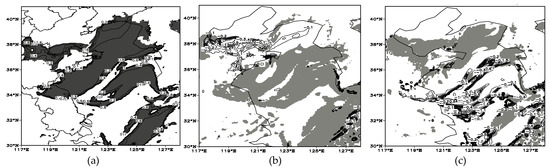 The simulated fog patches were identified as the atmospheric visibility (<1 km). Based on the control experiment result, the sea fog was distributed in the Laizhou Bay of the Bohai Sea, the north of the Yellow Sea, the south of Shandong Peninsula, and the middle and southern parts of the Yellow Sea (Figure 3a). The simulated sea fog range during the sensitivity experiments changed with the variation in SST (Figure 3b,c). When the SST increased/decreased by 2 °C, the atmospheric visibility in the Bohai Sea and the northern Yellow Sea region decreased/increased based on the difference between Exp. 2 and Exp. 1; the atmospheric visibility changes in the central and southern Yellow Sea region were reversed.