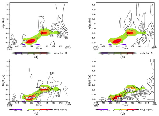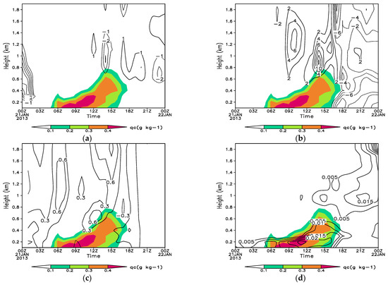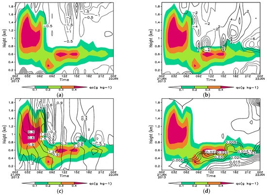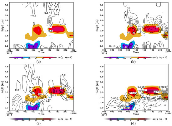 Regional average time series of contribution of three effects to relative humidity (contour, units: 10−5 s−1) in central Yellow Sea: (a) advection effect in U-direction, (b) advection effect in V-direction, (c) radiation effect, and (d) turbulence effect (shading: cloud water mixing ratio, units: g kg−1).