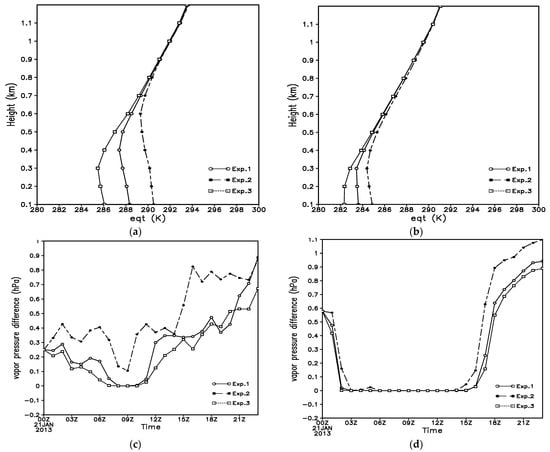 Vertical profiles of the regional mean pseudo-equivalent temperature for the control and sensitivity experiments (units: K) at 08 UTC on 21 January 2013 in (a) central and (b) northern Yellow Sea; regional average time series of water vapor pressure and saturation water vapor pressure difference (e-es) (units: hPa) for control and sensitivity experiments in (c) central and (d) northern Yellow Sea.