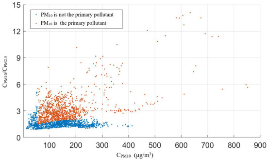 In addition, the criteria method stipulates that “the hourly mass concentration ratio of PM2.5 to PM10 is less than or equal to 50% of the average value of the ratio in the previous 6 h” [23], as shown in Equation (1):