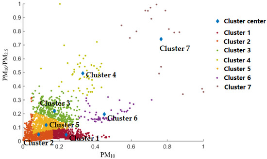Taking the ambient air quality monitoring data of Xi’an City, Shaanxi Province from 1 February to 30 April 2018, as the research object, including the hourly mean concentrations of PM10 and PM2.5, and the city’s hourly AQI, a total of 2136 groups of raw data were extracted from the Shaanxi Provincial Ambient Air Quality Monitoring Network Management Platform. After the data were preprocessed, MATLAB was used to run the MDPD-k-means clustering program, the number of clusters was determined and set to 7 according to the elbow rule, and the 95th percentile distance was taken. The clustering results converged after 22 iterations, and by the denormalization of the clustering results, seven cluster centers were obtained as shown in Table 2, and the clustering results were shown in Figure 3.