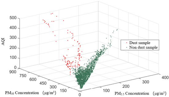 It can be seen from the determination process of the criteria method that the necessary conditions for the determination of sand and dust weather are the hourly concentration of PM10, the concentration ratio of PM10 to PM2.5, and the index of whether PM10 is the primary pollutant of AQI. Only if the above three conditions are met at the same time, can the basic requirements for sand and dust data identification be met. Therefore, the hourly concentration of PM10, the Individual Air Quality Index (IAQI) of PM10, and the ratio of PM10 to PM2.5 are analyzed as clustering elements.