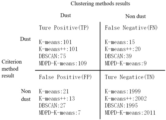 Taking the identification results of the traditional criteria method as the real classification, the confusion matrix was used to evaluate the accuracy of the MDPD-k-means clustering results, and compared with the k-means, k-means++ and DBSCAN clustering results. Density-Based Spatial Clustering of Applications with Noise (DBSCAN) is a density-based unsupervised machine learning clustering algorithm, which is suitable for detecting outliers in samples. Firstly, the similarity between the recognition results of the four groups of clustering algorithms for sand and dust data and the 118 groups of data recognized by the criteria method was compared. Since the purpose of the experiment was to identify the characteristic data of sand and dust, the identification results of the above four algorithms were divided into two categories according to the sand-dust data and the non-sand-dust data. Next, the intersect function of MATLAB was used to compare the cross relationship between the sand and dust characteristic data identified by the above four clustering algorithms and the sand and dust characteristic data identified by the criteria method, as shown in Table 4.