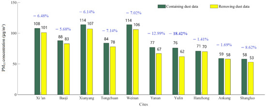 After excluding the impact of sand and dust, the annual average PM10 concentration in 10 cities has changed to varying degrees. It can be seen from Figure 6 that from 2016 to 2022, northern Shaanxi is heavily affected by sand and dust. Among them, Yulin is located in the transition zone between the Loess Plateau and the Inner Mongolia Plateau, and is close to the Mu Us Sand source, therefore is most seriously affected by sand and dust, with its PM10 concentration dropping by 18.42% after excluding the impact of sand and dust. Yan’an is severely affected, with its PM10 concentration dropping by 12.99%. Hanzhong and Ankang in southern Shaanxi are less affected by sand and dust, and their PM10 concentrations decrease by 1.41–1.69% after excluding the impact of sand and dust. Shangluo City is at the end of the sand and dust transmission path. Due to the low background value of its urban environment, it is prominently affected by sand and dust, and its PM10 concentration drops by 8.62% after excluding the impact of sand and dust. Cities in the Guanzhong area all belong to the area affected by sand and dust transmission. Due to the combined effect of sand and dust transmission and local fugitive dust, its PM10 concentration decreases by 5.68–7.14% after excluding the impact of sand and dust.