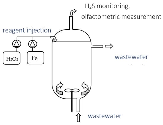 As such, it is necessary to identify efficient and cost-effective technologies for fast elimination of noxious odors and smells generated by putrefaction in wastewater storage, transport, and treatment systems [20]. Identifying a viable and effective solution to the problem is of great importance to the communities in areas at risk of exposure to odorants, whether periodic or continuous [21]. After all, such exposure impacts quality of life and regional prospects for tourism as well as industrial and general development [22]. The literature data point to the Fenton reaction (Fe2+/H2O2), Fenton-like reaction (Fe3+/H2O2), and H2O2 alone as useful means of organic removal, toxic substance degradation, color removal, and sanitization [23,24]. The effects of AOPs can thus indirectly inhibit the formation and emission of odorants in municipal facilities [25]. There have also been reports on direct and targeted use of such reagents to reduce emissions of H2S and other foul-smelling substances [26,27].