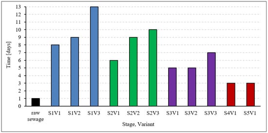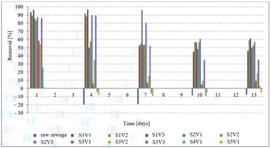 Raw sewage was already putrid by the end of day 1. S1V3 had the longest time-to-putrefaction at 13 days (Figure 2). Lower doses of H2O2 accelerated putrefaction, which occurred after 8 and 9 days in S1VT1 and S1V2, respectively. S2 performed significantly worse. At the highest reagent inputs, the oxidation system Fe3+/H2O2 (S2V3) suppressed the putrefaction process for 10 days (Figure 2). In S3, H2O2 alone managed to halt wastewater putrefaction for a period of 5 days at doses between 0.5 g H2O2/dm3–1.0 g H2O2/dm3 (S3V1–S3V2). The highest doses of the oxidant (S3V3) kept the wastewater in the anaerobic reactor from putrefying for 7 days. The Fe2+-only (S4V1) and Fe3+-only (S5V1) variants showed sub-optimal performance, with wastewater becoming putrid after 3 days’ retention time in the system (Figure 2).