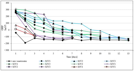 The ORP of raw sewage dropped to 42.3 ± 3.1 mV after just 1 day under anaerobic conditions. As the experiment went on, the observed levels varied between 123.9 ± 4.2 mV and 192.4 ± 5.7 mV (Figure 3 and Table S1). Introduction of Fe2+/H2O2 (S1) significantly reduced the rate of ORP drop-off. At the highest dose of the reagents (S1V3), the value evolved from 280.3 ± 7.4 mV on day 1 to 1.3 ± 0.5 mV on day 9. Longer retention times in the system led to a decrease in ORP below 0 mV. S1V1 and S1V2 maintained positive ORP values for 6 days’ retention in the system (Figure 3 and Table S1). Fe3+/H2O2 decelerated the ORP decrease in S2 compared to raw wastewater, but not to the extent seen in S1. The best performance was achieved in S2V3, where the decline was held back for 5 days. Amendment with 0.1 g Fe3+/dm3 and 0.5 g H2O2/dm3 (S2V1) successfully kept ORP above zero for a period of 3 days, whereas doses of 0.1 g Fe3+/dm3 and 1.0 g H2O2/dm3 (S2V2) did so for 4 days (Figure 3). H2O2 alone (S3) failed to match the performance of the Fe/H2O2 systems. The oxidant doses used for S3V1 and S3V2 inhibited the redox processes for only 2 days. In contrast, 2.0 g H2O2/dm3 (S3V3) maintained ORP above zero for 4 days. The Fe2+-only (S4V1) and Fe3+-only (S5V1) variants also performed poorly (Figure 3 and Table S1).