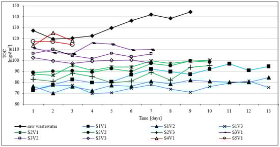 TOC in the raw wastewater averaged between 119.6 ± 8.4 mg/dm3 and 144.6 ± 12.5 mg/dm3 (Figure 4 and Table S2). The Fe2+/H2O2 oxidizing system (S1) reduced its value to 72.9 ± 3.9 mg/dm3 in S1V3 to 76.0 ± 4.4 mg/dm3 in S1V2 after just 24 hours’ retention in the system. Variant S2V3 had lower TOCs—between 79.8 ± 5.8 mg/dm3 and 95.1 ± 8.3 mg/dm3. Slightly less pronounced removal was noted for S2V1 and S2V2 (Figure 4 and Table S2). Significantly poorer results were obtained when H2O2 (S3) or Fe ions (S4, S5) were the sole reagents in the wastewater (Figure 4 and Table S2).