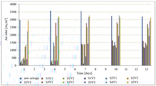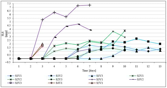 The composition of the gas generated from raw wastewater was as follows: CH4—0.0%; CO2—0.0%; O2—20.5 ± 1.3%; N2—79.5 ± 2.1%; H2S—0.0 ppm; NH3—0 ppm. Oxygen levels decreased on the second day of the experiment. After H2S started forming, NH3 emerged as well at 51 ± 3 ppm. On day 5, NH3 concentrations started to exceed 500 ppm and remained at around this level until the end (Table S4). In S1V1, NH3 was first detected on day 6 at 72 ± 2 ppm and did not exceed 93 ± 4 ppm till the end of the experiment. As at day 13, the gas contained 15.8 ± 1.7% oxygen and 48 ± 2 ppm NH3. In S1V2 and S1V3, NH3 appeared on day 7 and its concentration was at around 18 ± 3 ppm until day 9. By the end of the experiment, the levels in the two variants had risen to 47 ± 5 ppm and 12 ± 1 ppm, respectively. CO2 varied between 0.5% and 2.0% across all variants and in raw wastewater (Table S4).