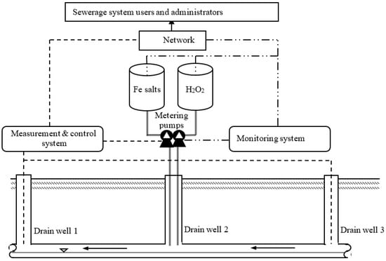 The design for this sewage and holding tank AOP deodorization system calls for two components: an injection unit and a monitoring/control/measurement unit. The injection unit includes storage tanks for chemical reactant solutions (Fe salts, hydrogen peroxide) and suitable metering pumps, which can be controlled via signals from the control/measurement equipment or operated manually. Since chemical reagents can be supplied into the sewer system through either pressure-free (drain well, holding tank) or pressurized means (closed sewer pipes), appropriate metering fittings are to be used.