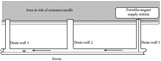 Diagram of the manual reagent injection system for sewage networks, with portable reagent supply station.
