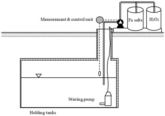 A Fenton reagent can likewise be injected into holding tanks (Figure 10). In this case, however, an efficient system must be provided for mixing the collected wastewater with the chemical reagents, e.g., mechanical agitator, ejector, or stirring pump.