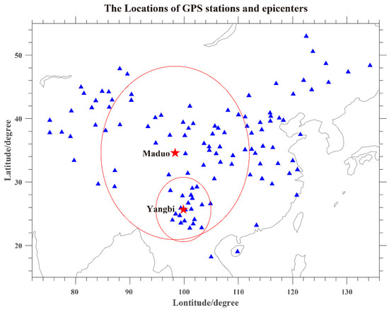 The locations of GPS observing stations and epicenters. The red pentagrams represented the epicenters of Maduo and Yangbi, the blue triangles represent the GPS observation stations, and the red circles represent the seismogenic zone drawn according to the strain radius. Obviously, the seismogenic zone of Yangbi was almost in the seismogenic zone of Maduo.