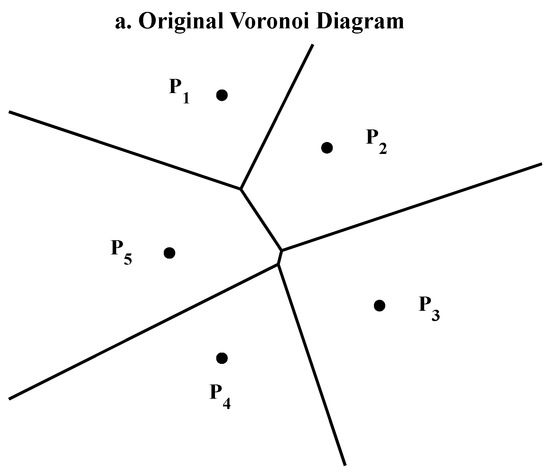 Assuming that the interpolated point M had five natural neighbors, we generated the Voronoi diagram (Figure 2a) using the five natural neighbors, and then generated the Voronoi diagram (Figure 2b) again after adding the point M. The two Voronoi diagrams intersected and enclosed five polygons (Figure 2b), and , where S is the sum of the areas of the five polygons and (i = 1, 2, 3, 4, and 5) is the area of polygon .