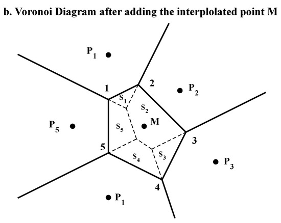 Voronoi diagram. The Voronoi diagrams of subfigure (a,b) were the results before and after adding the interpolated point M, respectively. The points of (i = 1, 2, 3, 4, and 5) were the natural neighbors of point M, and (i = 1, 2, 3, 4, and 5) was the area of the polygon corresponding to .