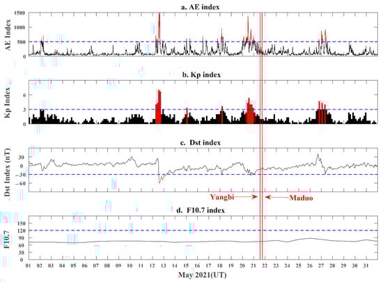 The four panels showed the variations of AE, Kp, and Dst indices and F10.7 solar flux in May 2021, respectively. Red data represents exceeding the threshold, blue dotted line represents the threshold line. The two red vertical lines represent the time of the earthquakes.